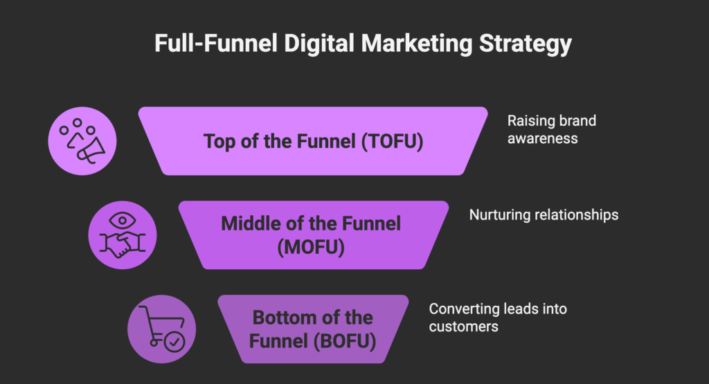 A full-funnel digital marketing strategy helps you connect with potential customers at every stage of their journey. From the moment they first hear about your brand to the time they make a purchase (and hopefully return for more), this strategy ensures you’re always there, guiding them with the right message at the right time.